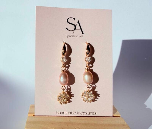 Pink-Lila blush echte zoetwater parels en bloemen Sparkles oorbellen.